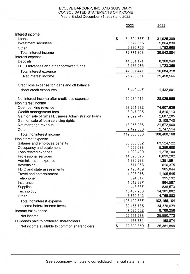 “In our opinion, the accompanying consolidated financial statements present fairly, in all material respects, the financial position of Evolve Bancorp Inc. and Subsidiary as of December 31, 2023 and 2022, and the results of their operations and their cash flows for the years then ended in accordance with accounting principles generally accepted in the United States of America.