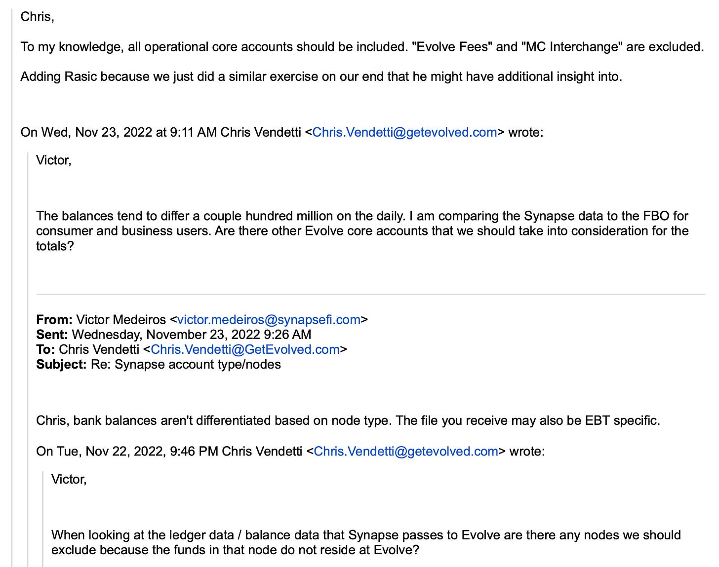 Yet, at the time Crowe would have conducted the 2022 and 2023 audits, Evolve was already aware of and attempting to work through significant reconciliation challenges with Synapse — issues that included discrepancies between Synapse’s ledgers and what Evolve believed it held of hundreds of millions of dollars, per an email Evolve’s open banking controller, Chris Vendetti, exchanged with Synapse’s controller Victor Medeiros in November 2022.