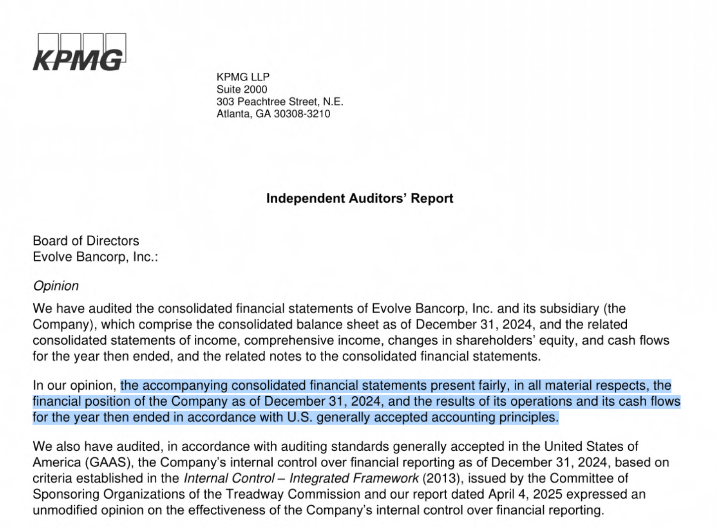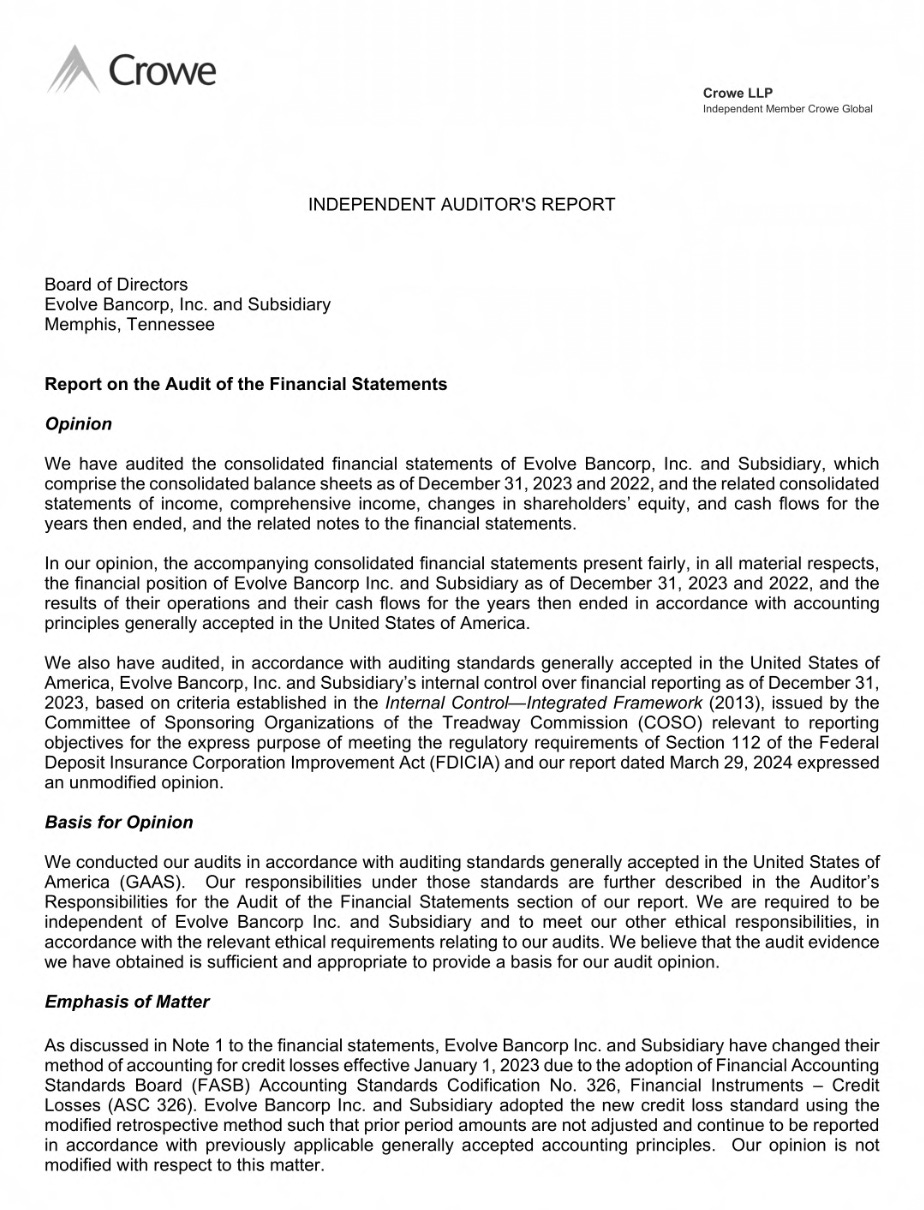 We also have audited, in accordance with auditing standards generally accepted in the United States of America, Evolve Bancorp, Inc. and Subsidiary’s internal control over financial reporting as of December 31, 2023, based on criteria established in the Internal Control—Integrated Framework (2013), issued by the Committee of Sponsoring Organizations of the Treadway Commission (COSO) relevant to reporting objectives for the express purpose of meeting the regulatory requirements of Section 112 of the Federal Deposit Insurance Corporation Improvement Act (FDICIA) and our report dated March 29, 2024 expressed an unmodified opinion.”