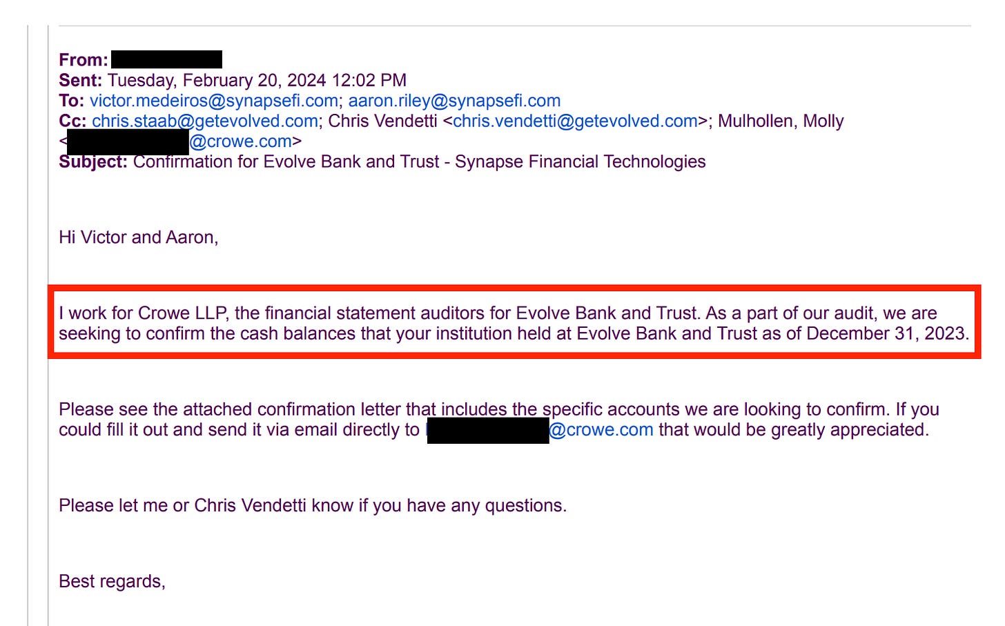 As part of that audit, Crowe was seeking to “confirm the cash balances that [Synapse] held at Evolve Bank and Trust as of December 31, 2023.”