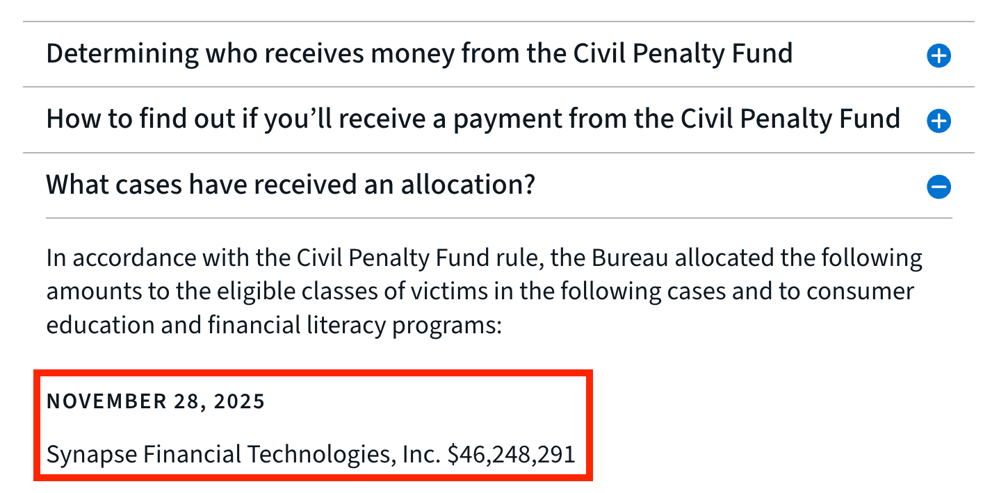 Christmas came early for the victims of the Synapse/Evolve catastrophe: the Consumer Financial Protection Bureau quietly updated its website to reflect that its Civil Penalty Fund has allocated $46,248,291 toward making “end users” whole. The news was first reported by Bloomberg Law’s Evan Weinberger last Thursday.