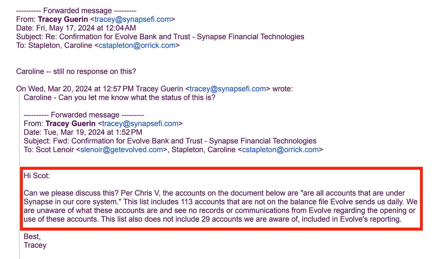 Synapse’s general counsel also flagged that the list Evolve provided didn’t include 29 accounts that it seemingly should have.