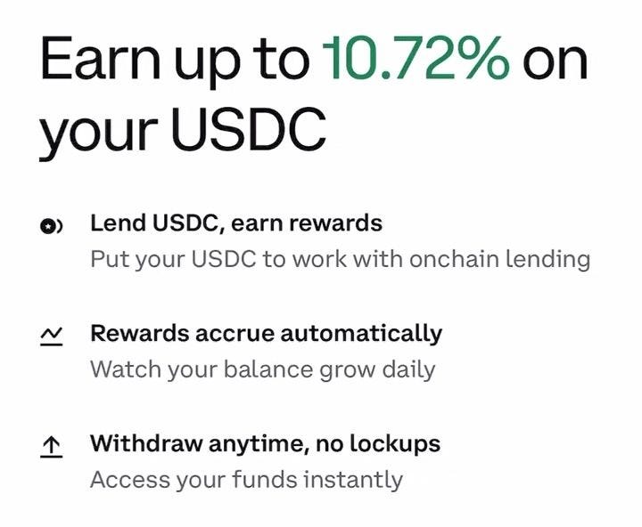 Coinbase advertises users can earn up to 10.8% on their Circle-issued USDC held on the platform. How can Coinbase facilitate such outsized yields on stablecoins, when the yield on one-year Treasuries is hovering around 3.6%? By lending it out.