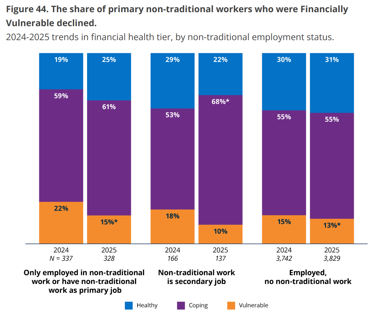 Workers whose only or primary employment is in a non-traditional job (eg gig work) are significantly less likely to be considered financially “healthy” vs. those in traditional employment, though those who have a non-traditional job as secondary employment are less likely to be considered financially “vulnerable.”