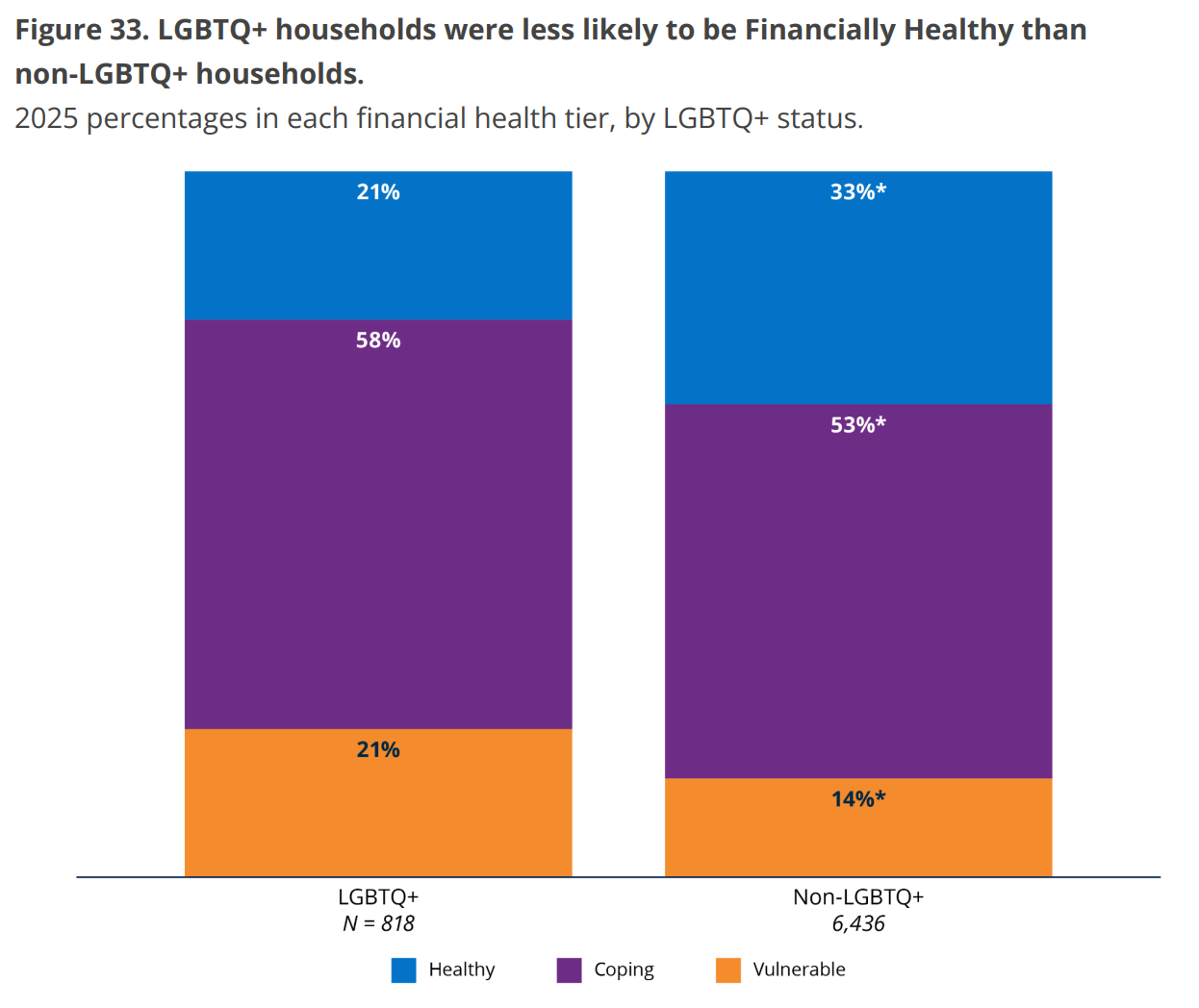 According to the Financial Health Network survey and report, LGBTQ+ households are significantly less likely to be financially “healthy” than non-LBTQ+ households, with 21% falling into the financially “vulnerable” category.