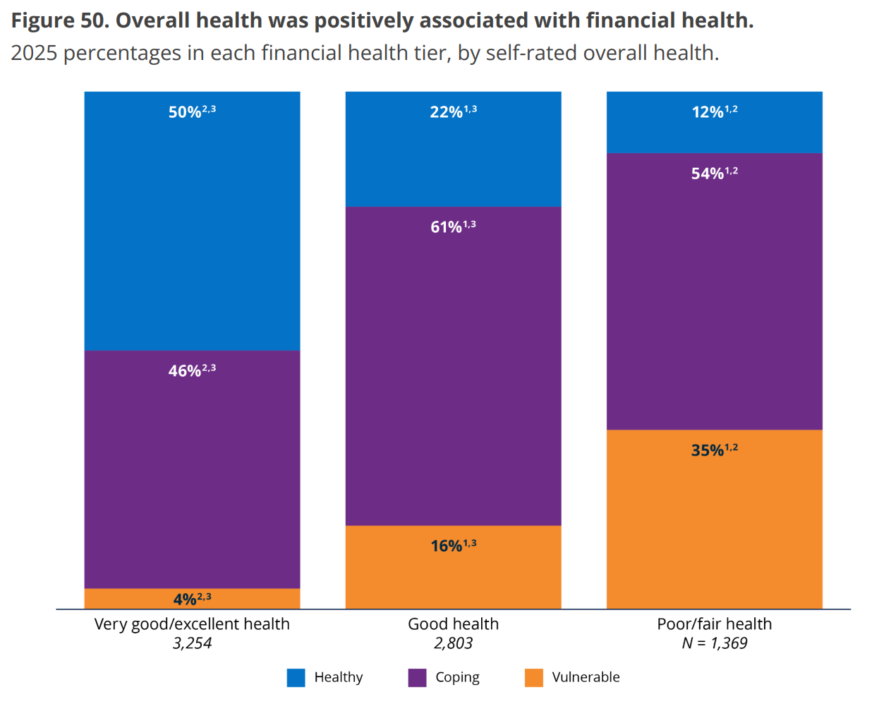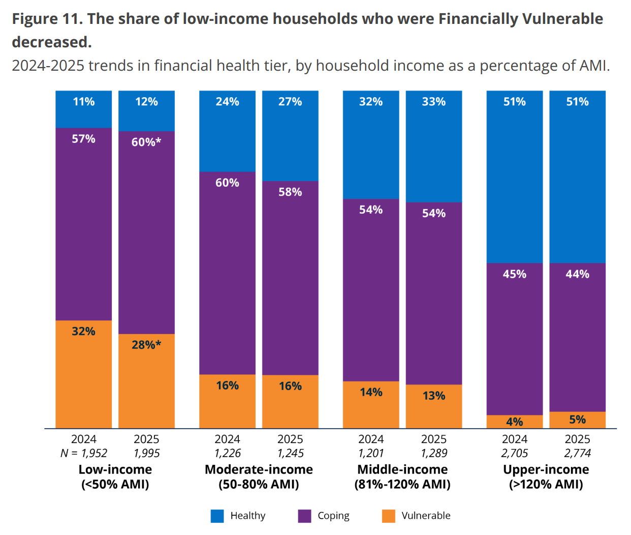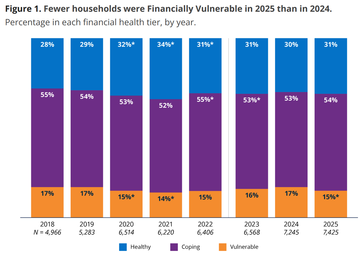 Breaking down financial health status by income tier, it’s downright remarkable that fewer low-income households are deemed “vulnerable,” with a growing share classified as “coping” or “healthy.” Moderate-, middle-, and upper-income households did not see any statistically significant changes vs. 2024.