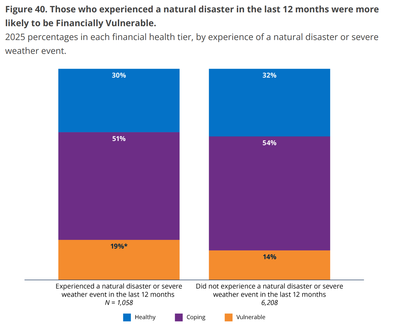 Many American homeowners are underinsured, including an estimated 1 in 8 that lack homeowners insurance altogether. So it shouldn’t come as a surprise that households that faced a natural disaster or severe weather event in the last 12 months were somewhat more likely to be considered financially “vulnerable.”