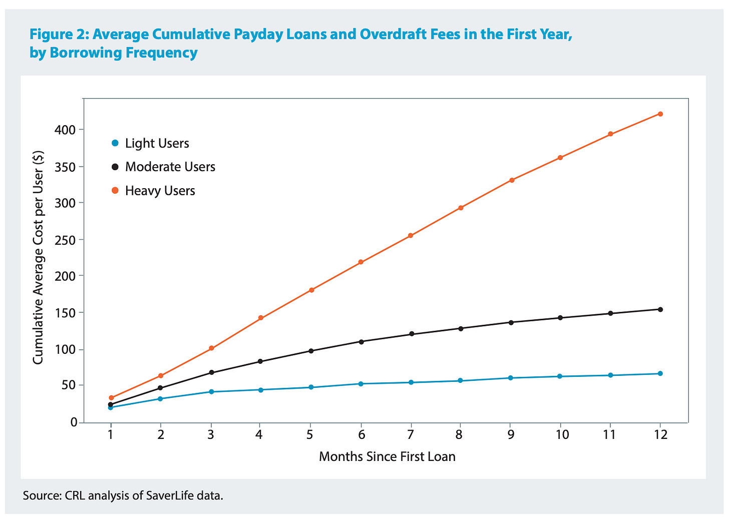 CRL found that “light” users of DTC EWA apps incurred an average of $66 in app and overdraft fees in their first year, “moderate” users incurred an average of $154, and “heavy” users incurred an average of a whopping $421.