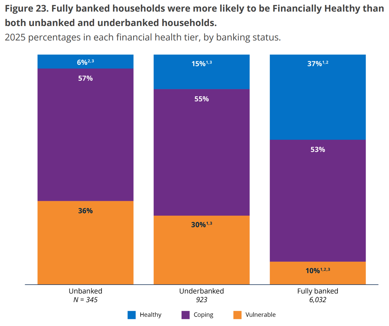 Unsurprisingly, households that are “unbanked” or “underbanked,” using the FDIC’s definitions of those terms, are far more likely to be financially vulnerable vs. fully banked households.