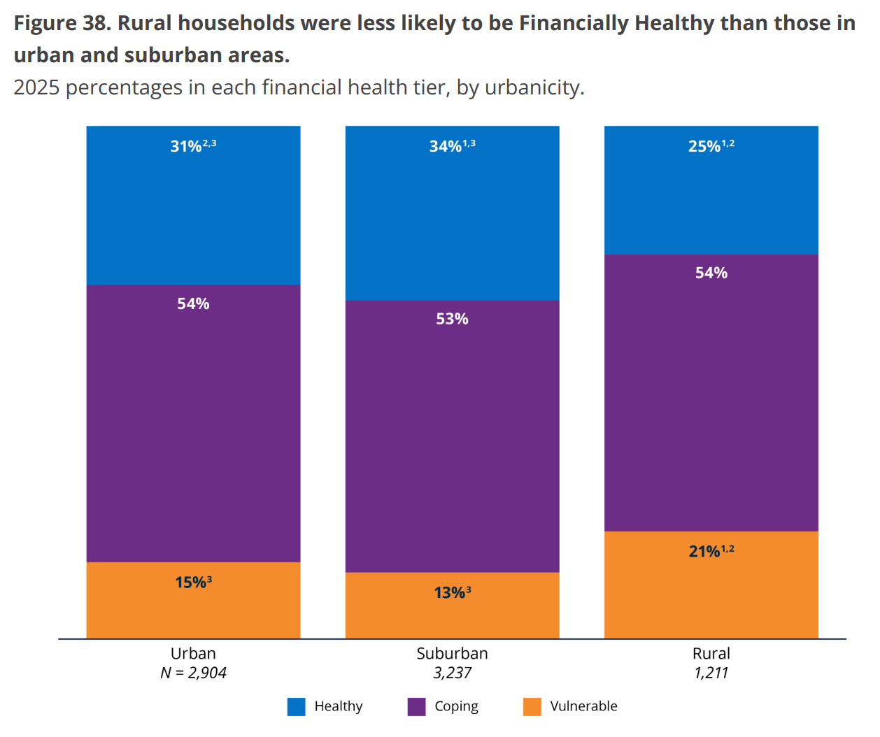 While financially fragility is often thought of or portrayed as an “inner city” or urban issue, the report belies that stereotype, as rural households are actually materially more likely to show signs of being financially “vulnerable.”
