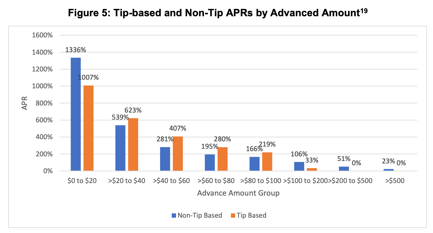 The same report found that users paid a total cost of as much as 16% of the advance amount, for the smallest advances from providers that accepted tips, to as little as 1% of the advance amount, for the largest advances.
