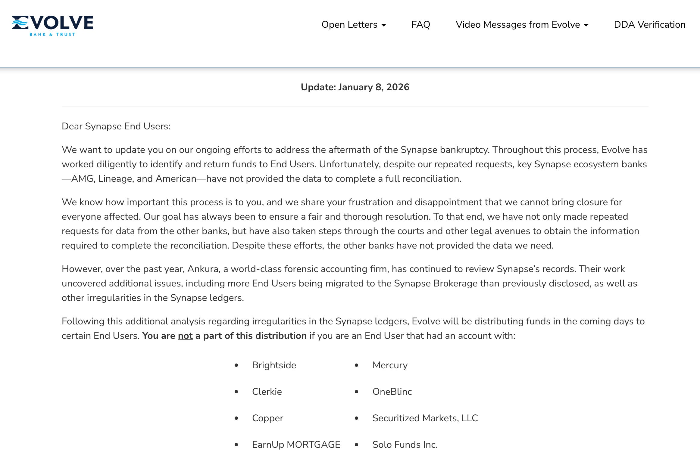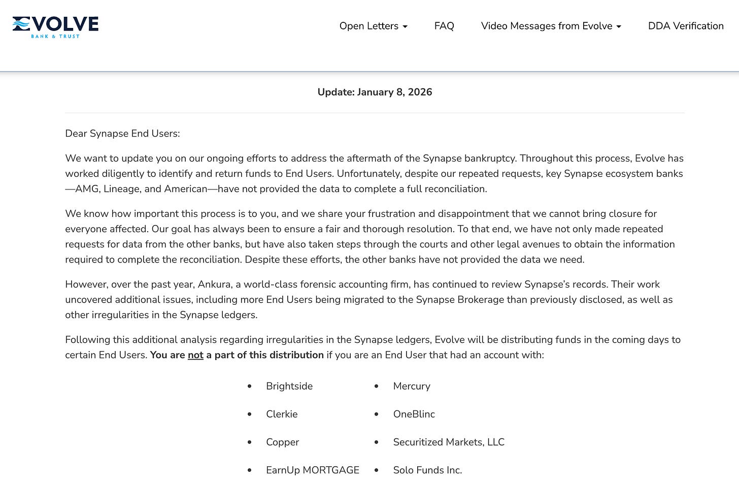 The update makes clear that Evolve’s “reconciliation” efforts are ongoing — despite claiming during the Synapse bankruptcy, apparently falsely, that the bank had “completed” its reconciliation efforts more than a year ago, on October 18th, 2024.