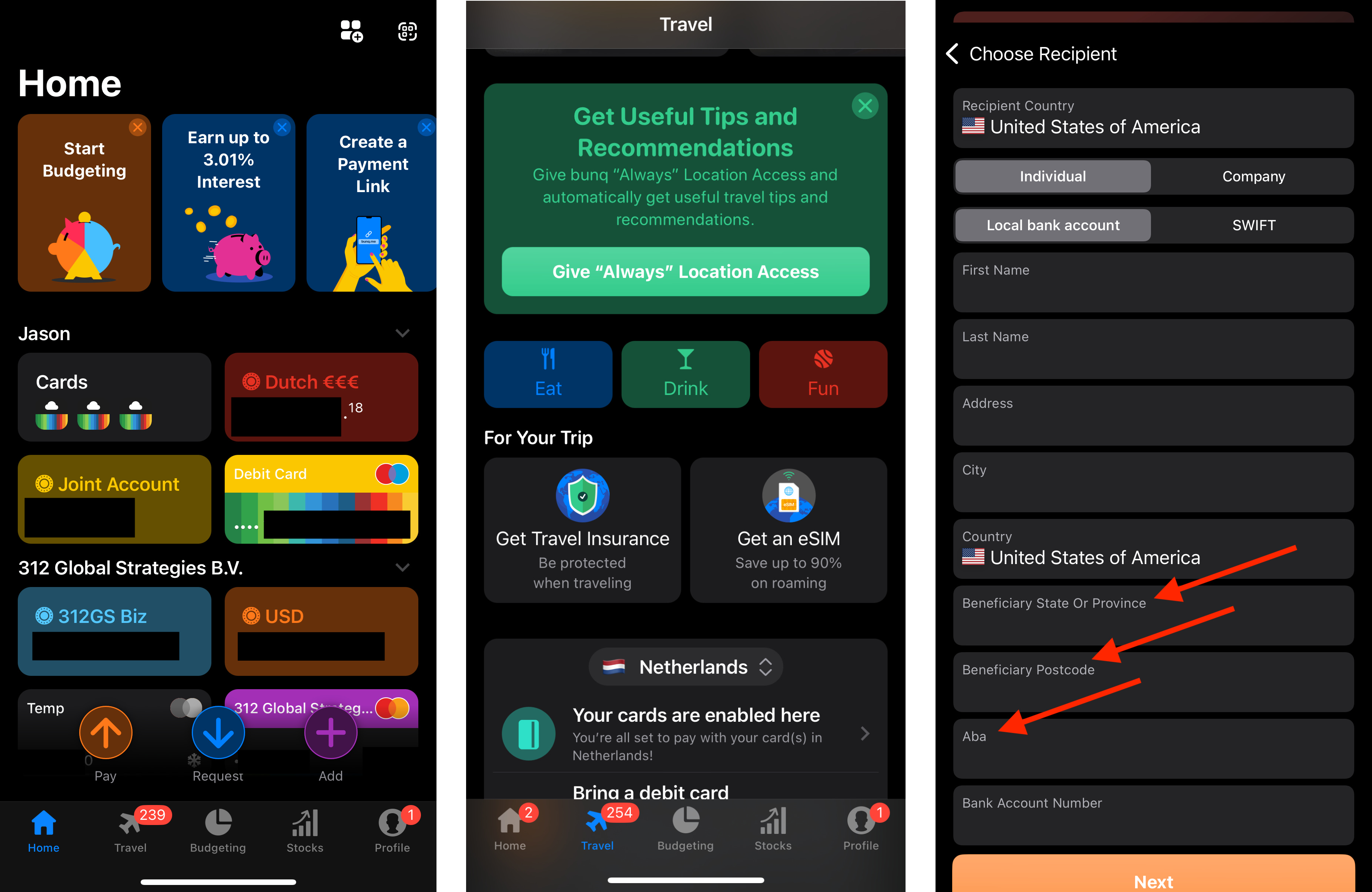 For instance, in a screen to setup a funds transfer to a recipient in the United States (above right), bunq refers to a “State or Province,” even though the United States has no provinces (Puerto Rico, Guam, etc. are “territories”), “Beneficiary Postcode” instead of ZIP code, and “Aba” instead of the commonly used and better understood “Routing number.”