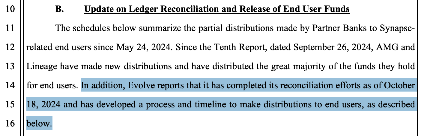 Following this additional analysis regarding irregularities in the Synapse ledgers, Evolve will be distributing funds in the coming days to certain End Users.”