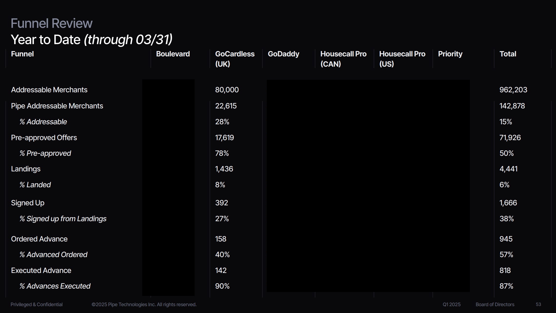 The deal gave Pipe access to some 80,000 GoCardless merchants, of which the lender classified 28%, or 22,615, as “Pipe-addressable,” though only 142 GoCardless merchants took advances from Pipe by the end of Q1 2025.