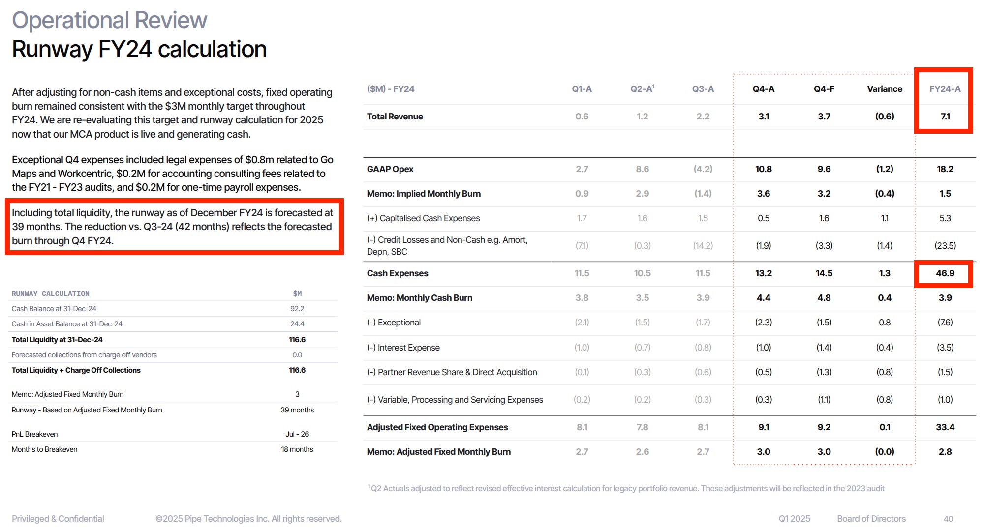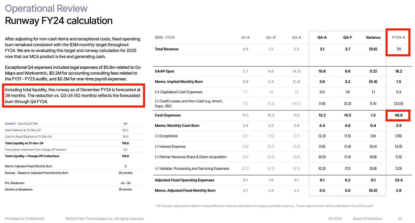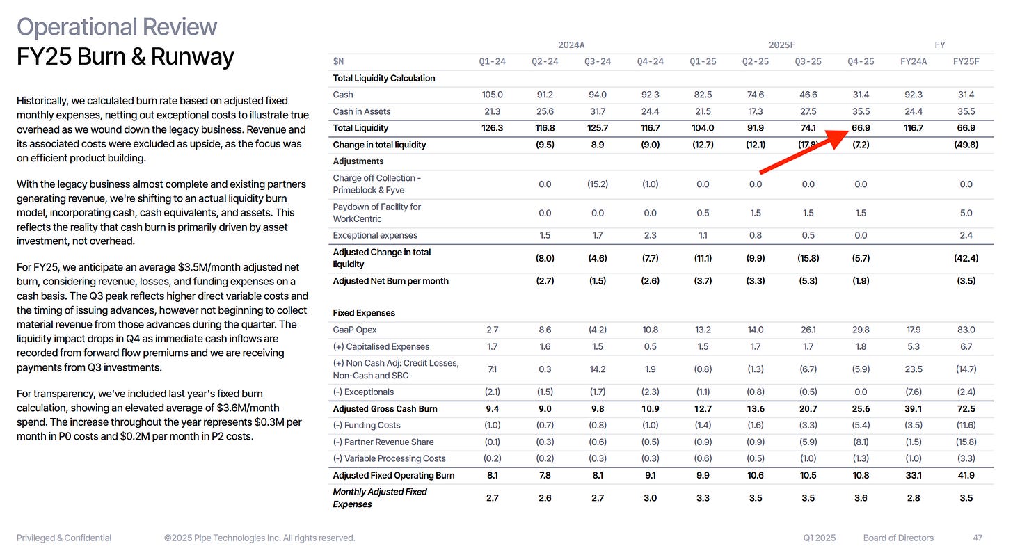 Per the plan reviewed at that Q1 2025 board meeting, despite the growing originations and headcount, Pipe forecast ending 2025 with $66.9 million in “total liquidity” (cash and cash in assets).