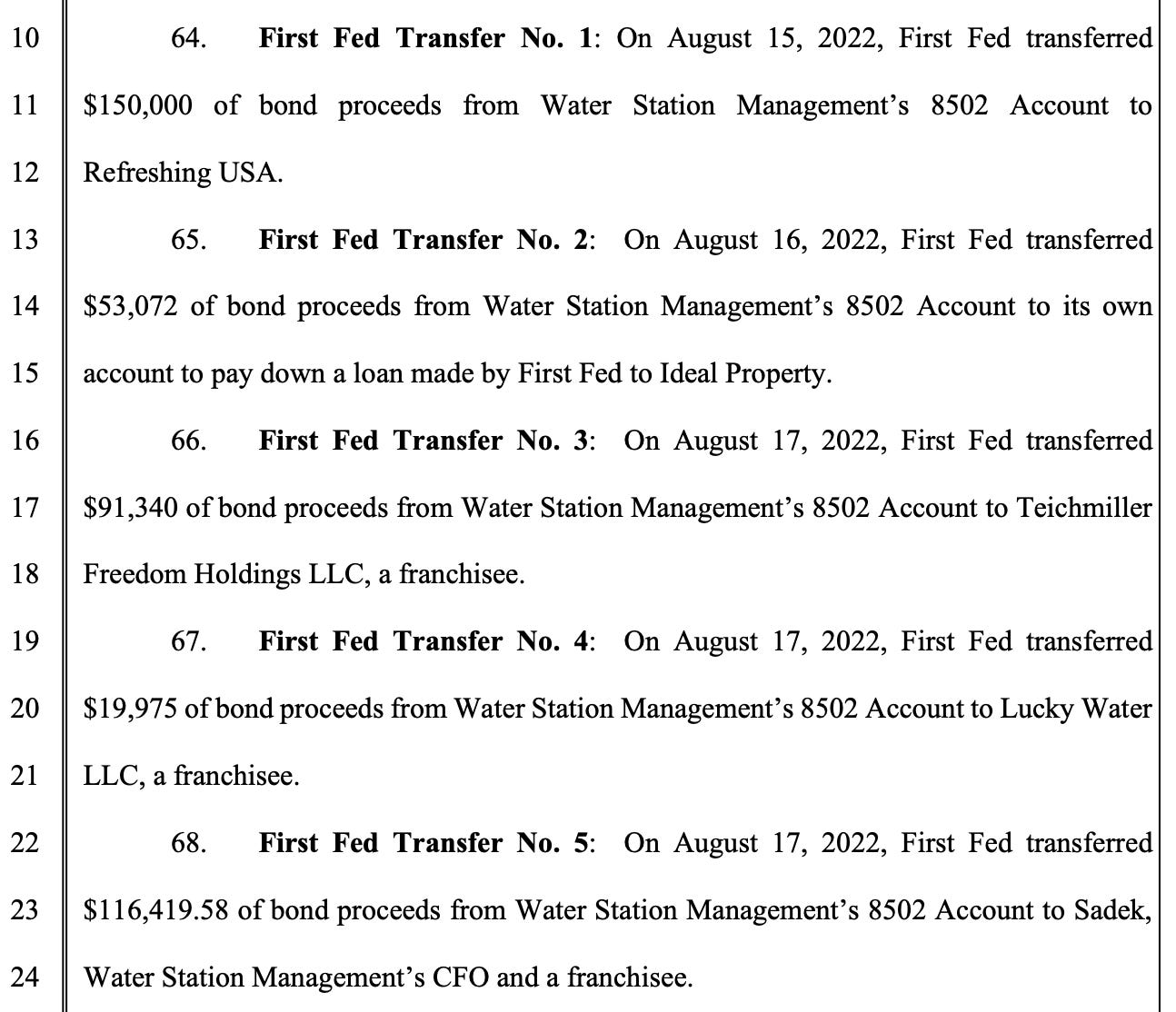 The 3|5|2 lawsuit alleges that by August 2022, First Fed began an investigation in WaterStation and its finances, which confirmed that the purported machines were not generating enough revenue to cover machine owners’ loan payments to First Fed.