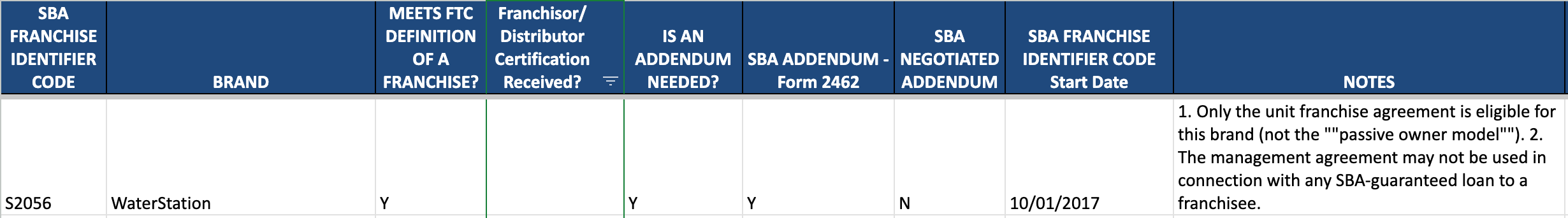 WaterStation applied for SBA eligibility and was issued an SBA Franchise Identifier Code on October 1, 2017, making its franchisees eligible for SBA financing.
