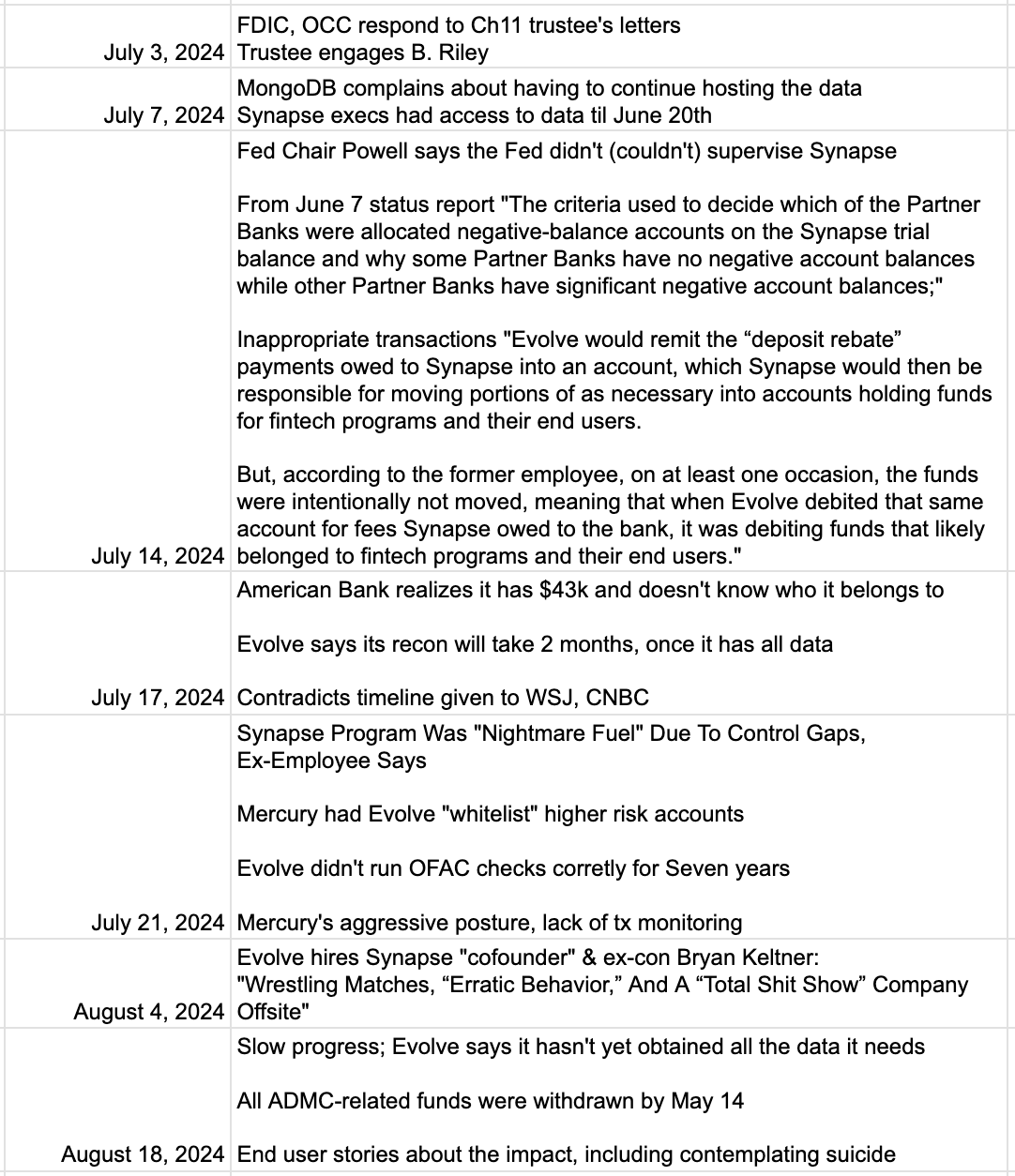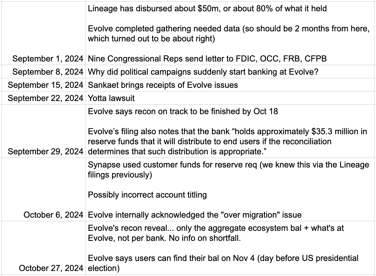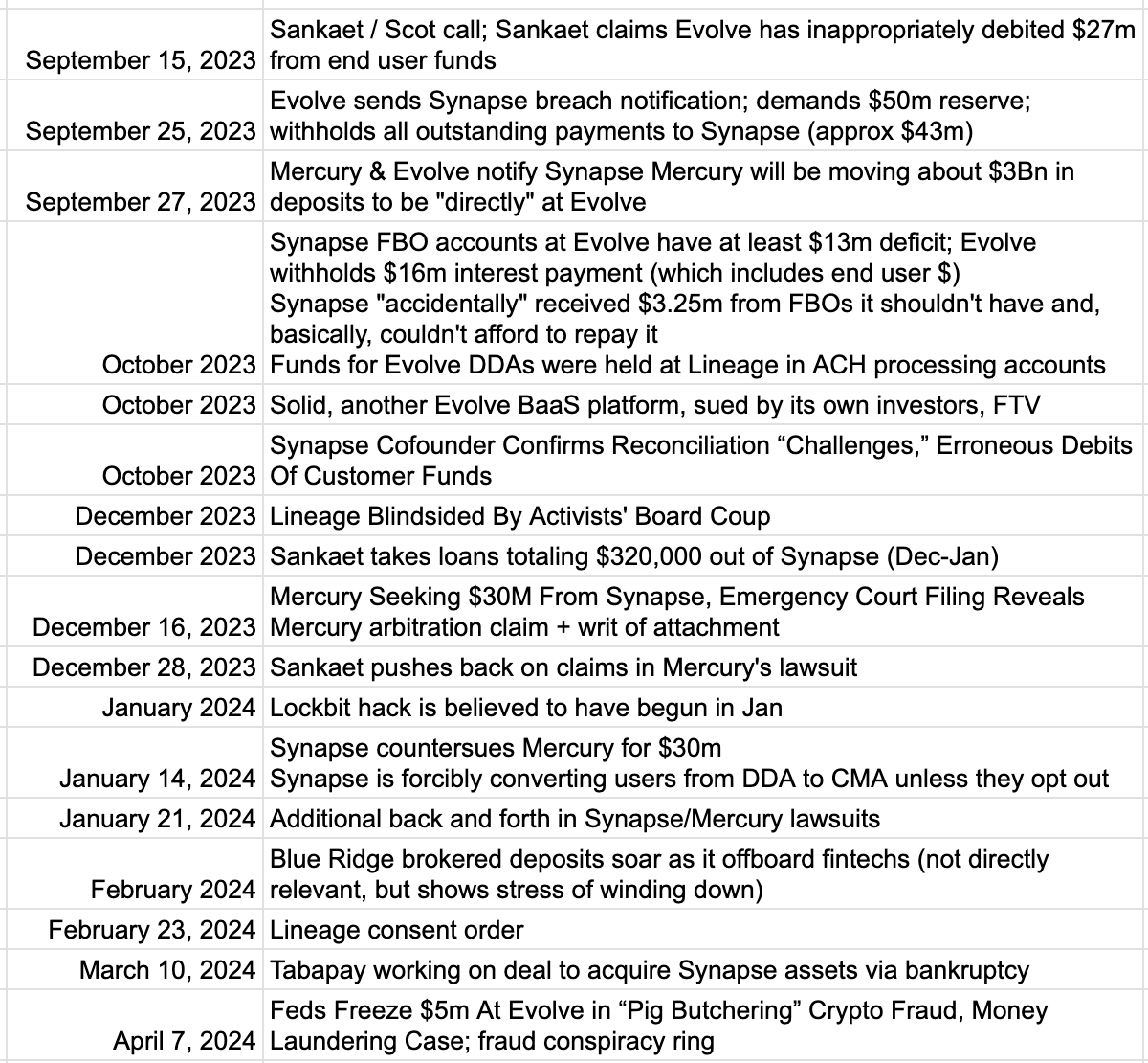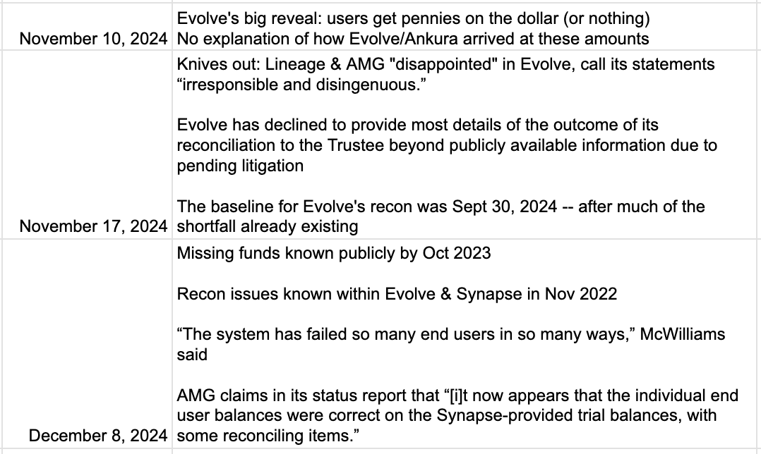 While what was unfolding between Synapse, Mercury, and Evolve wasn’t known at the time, the severity of the problems began to leak out into the public, with this newsletter reporting on October 8th, 2023, that there was a disagreement over who was responsible for covering what was believed at the time to be a $13 million shortfall in end user funds.