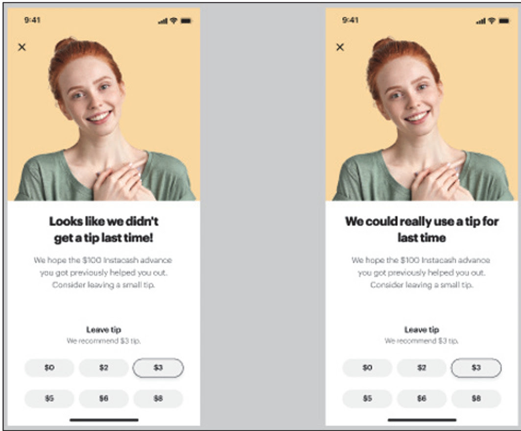 For users that changed the default setting in order not to leave a tip, the complaint says that MoneyLion would “retarget” those users the next time they sought to take an advance, reminding them that they hadn’t tipped the previous time.