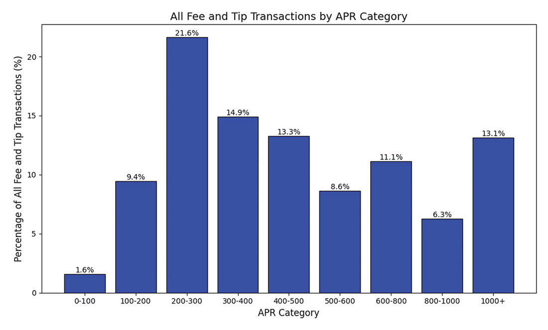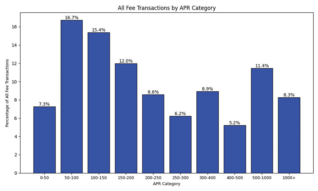 The most common transaction was for $20, with the most common fee for that size transaction being $2.99. Given the small size and the short duration, the APR for such a transaction would be 750%.
