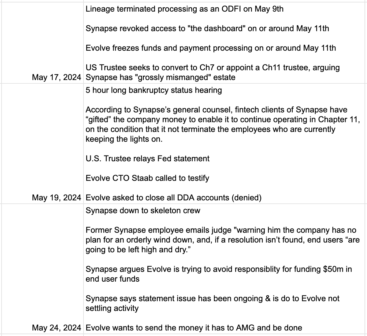 In a bankruptcy hearing the day after the deal collapsed, on May 9th, Evolve’s lawyer reiterated that Evolve’s position was that accounts at Evolve related to Synapse were fully funded and that there “[were] no end user issues whatsoever.”