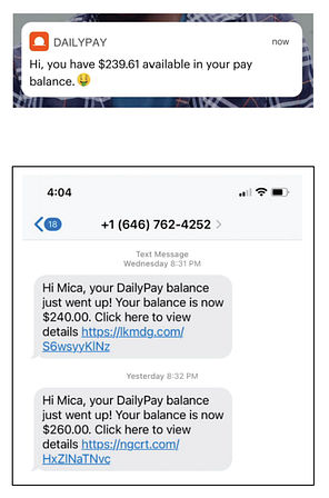 Although DailyPay doesn’t leverage tips and, therefore, doesn’t deploy some of the kinds of “dark pattern” user experience techniques that MoneyLion seems to use, it does, per the complaint, use push alerts and text messages to make users aware of their “pay balance,” thereby implicitly encouraging them to make use of it.